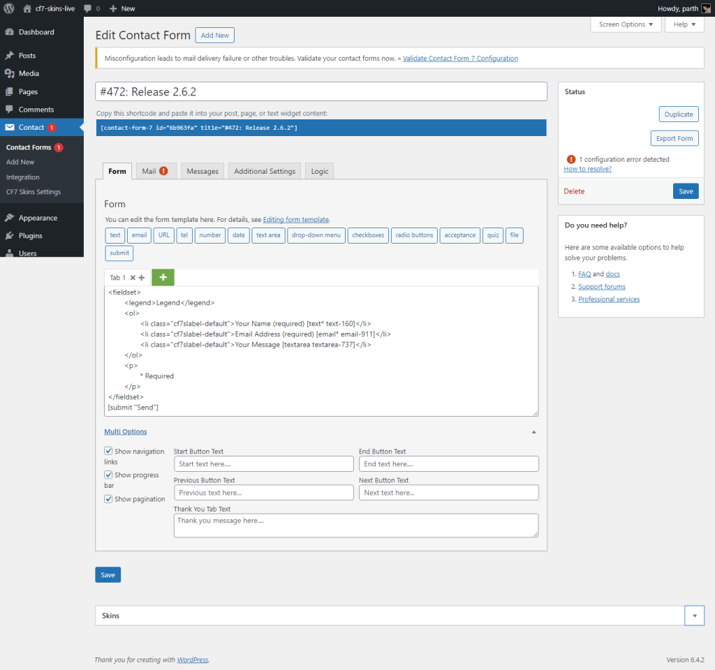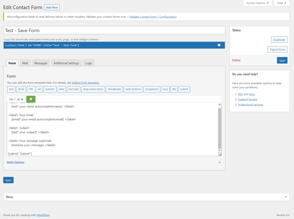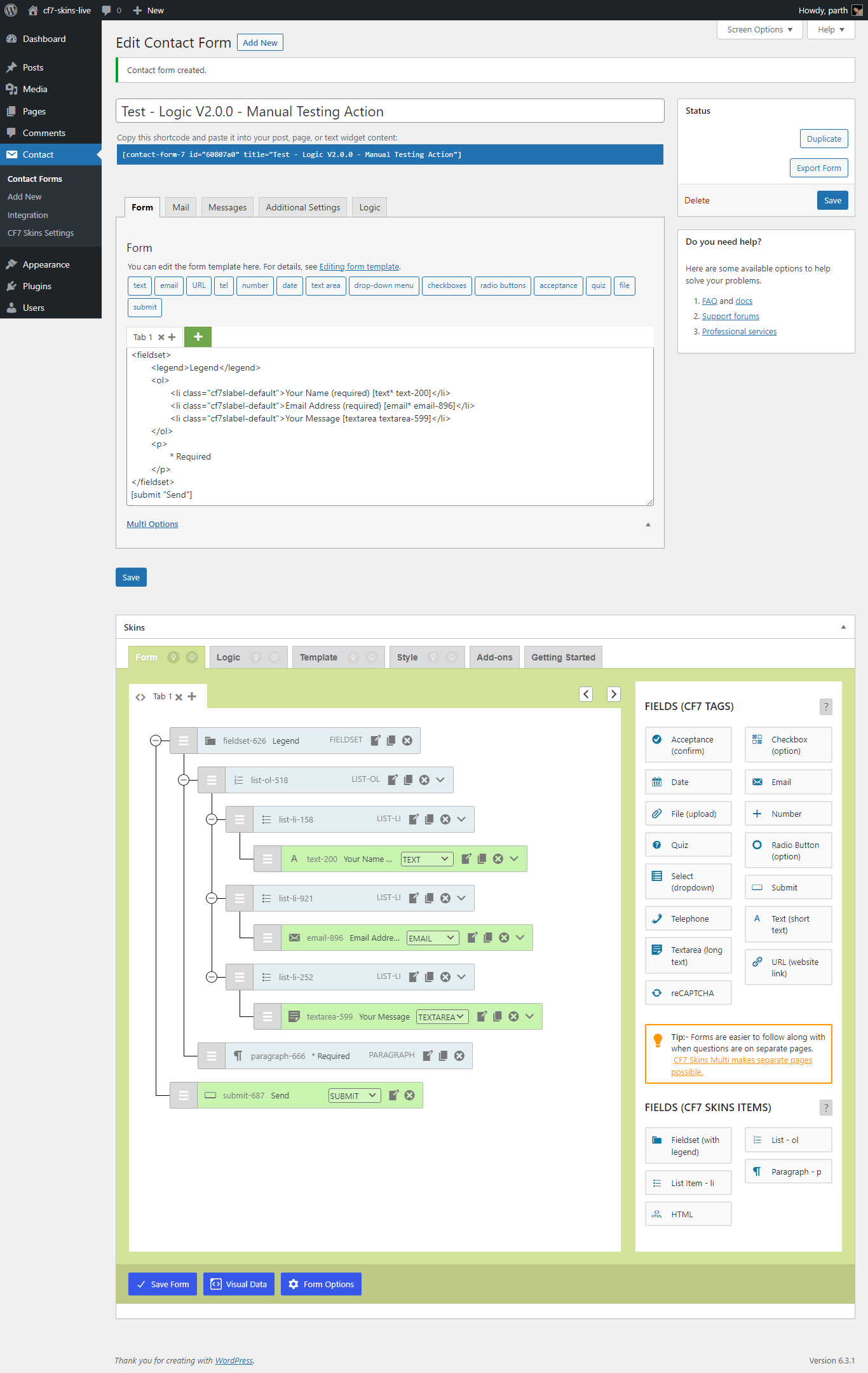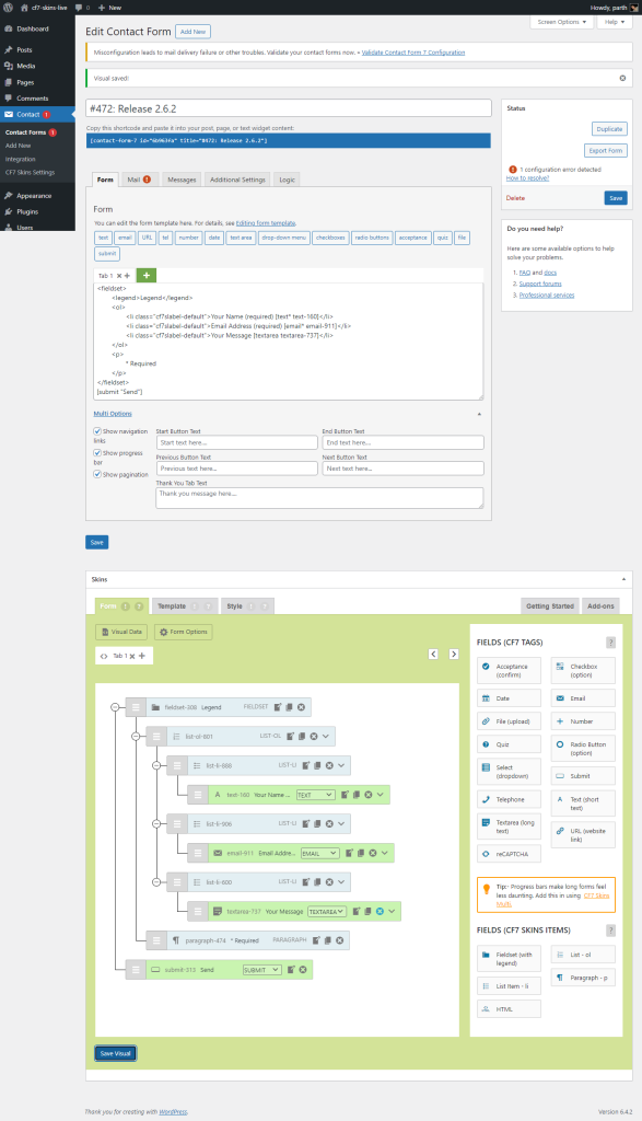 NOTE: In testing this action we are concerned with what happens when we use the Save button in the CF7 Area. Using the Save Visual button is documented as a separate action.