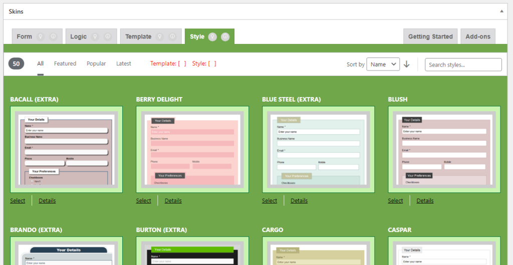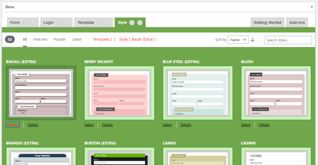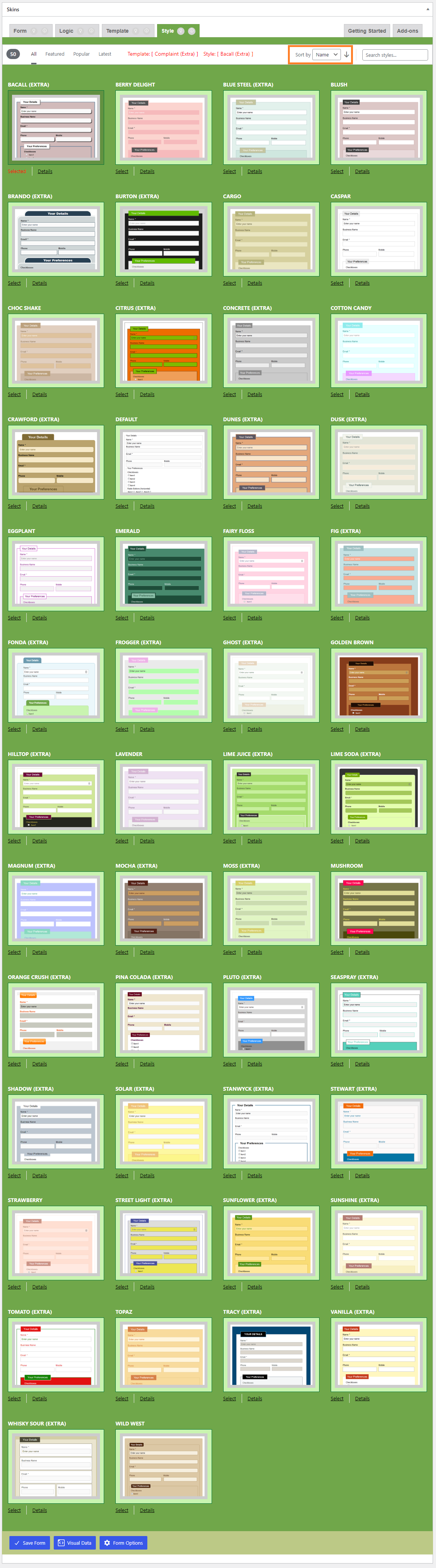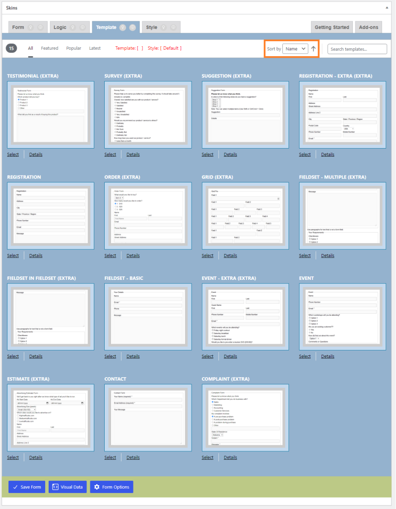 The sort option select box changed to “Name”