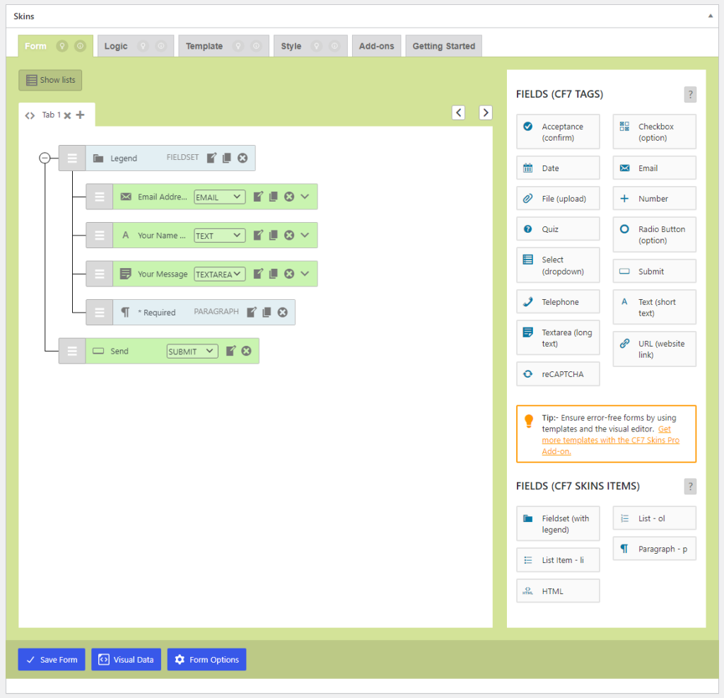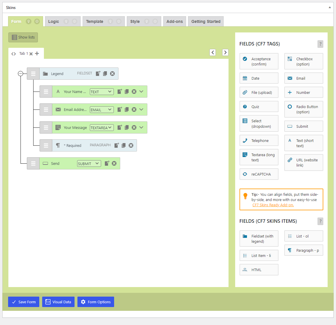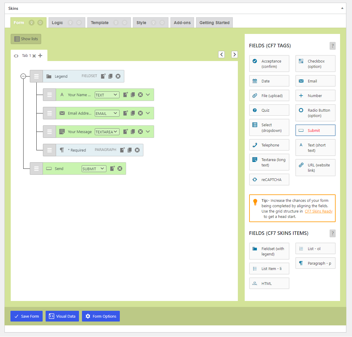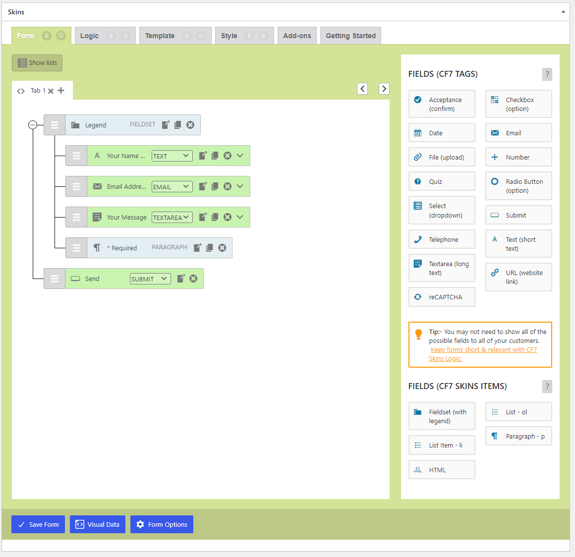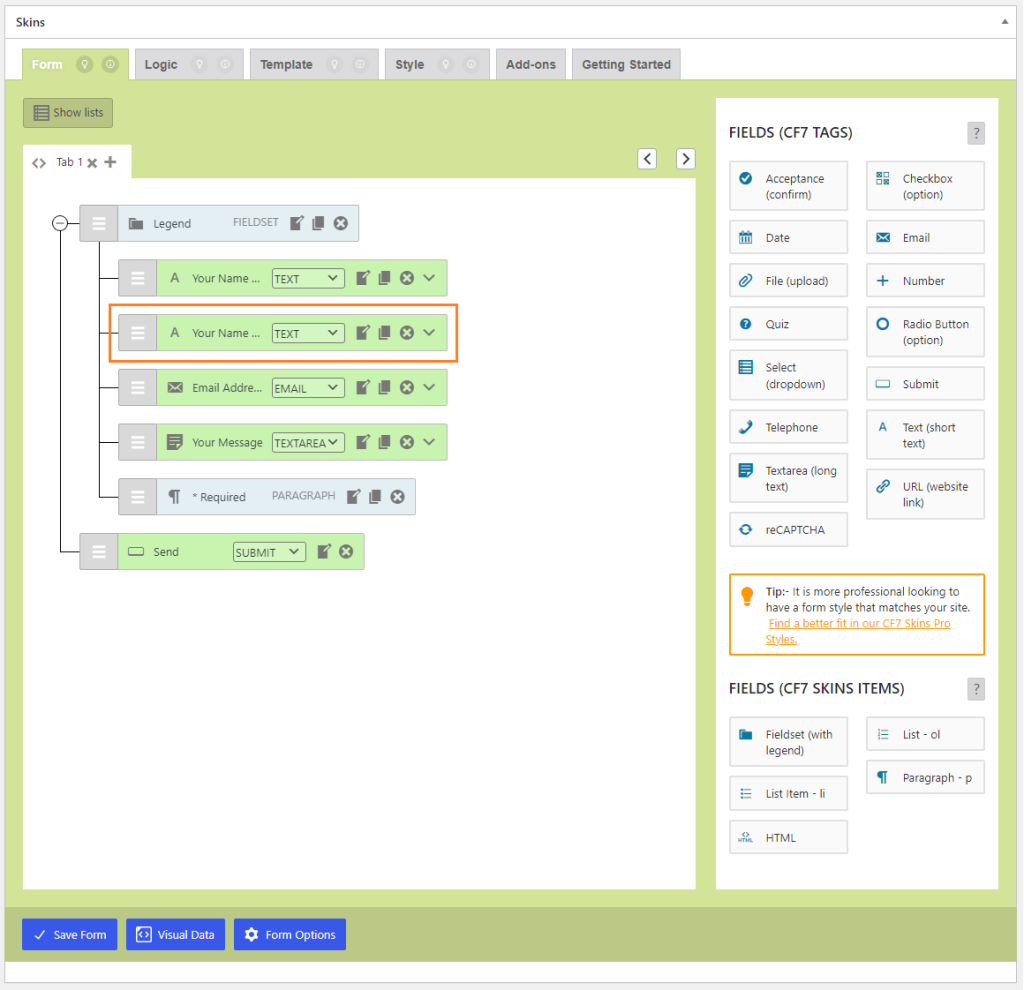 If the Show Field Names checkbox is checked, the field names appear on the Visual Form