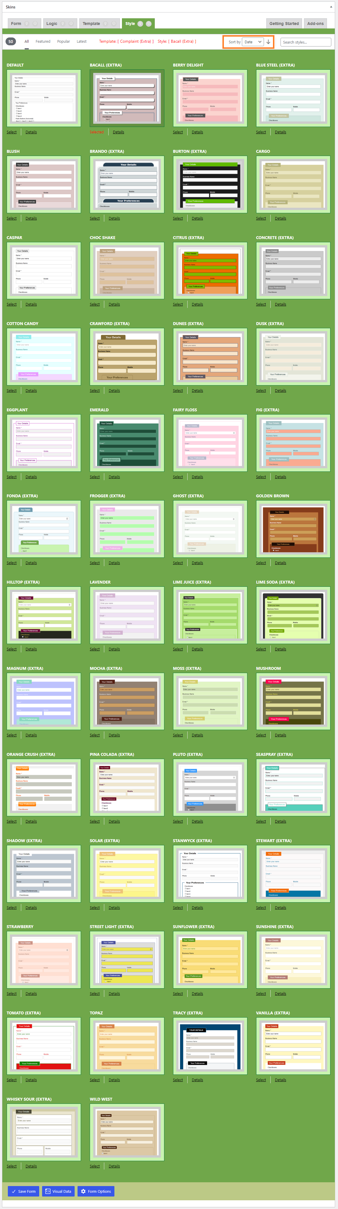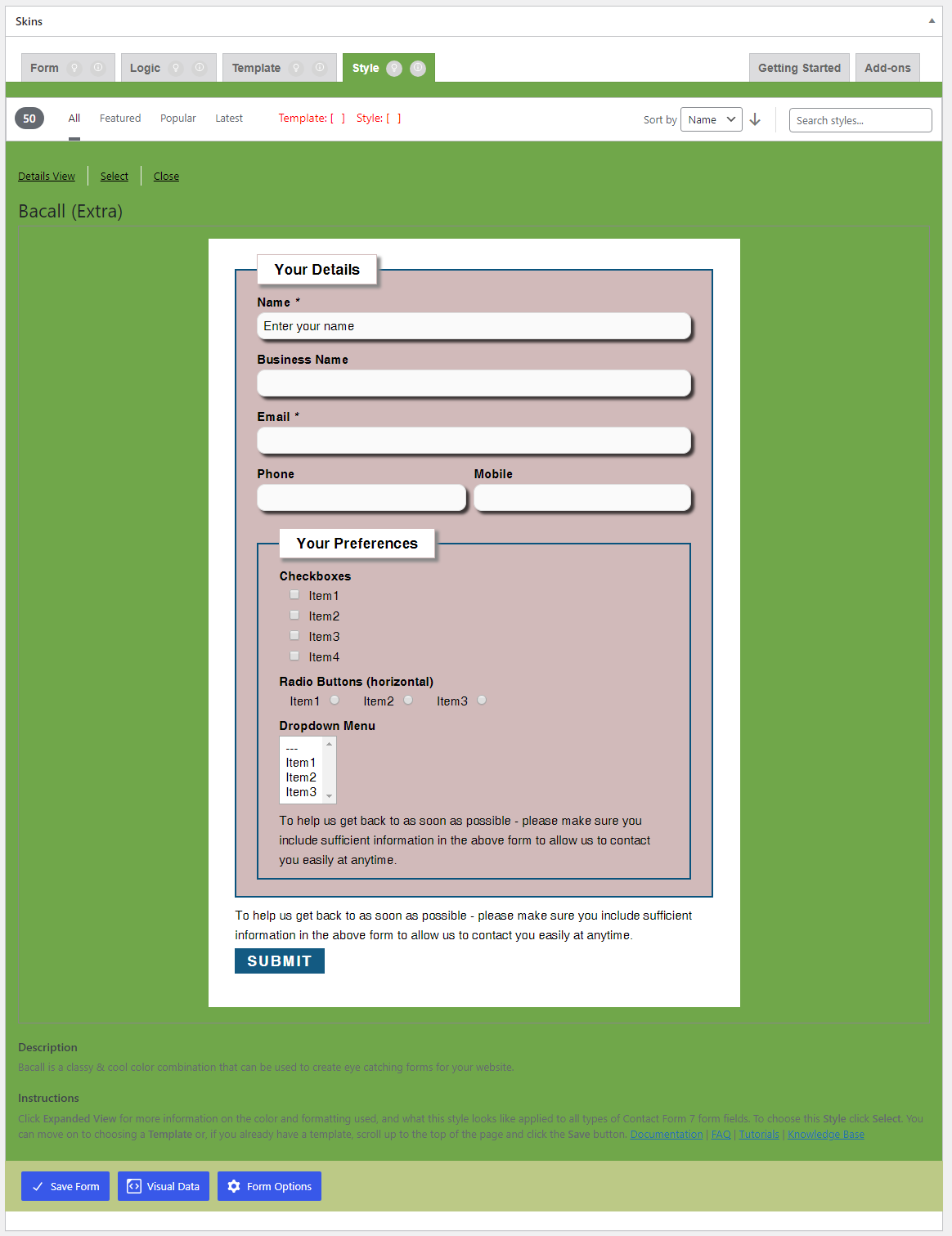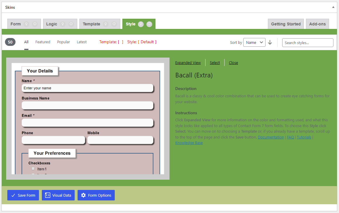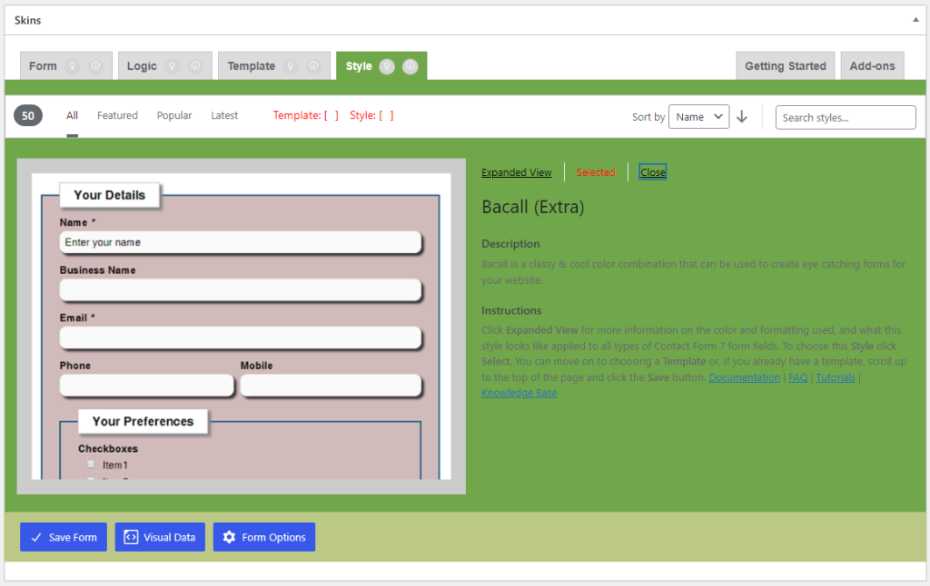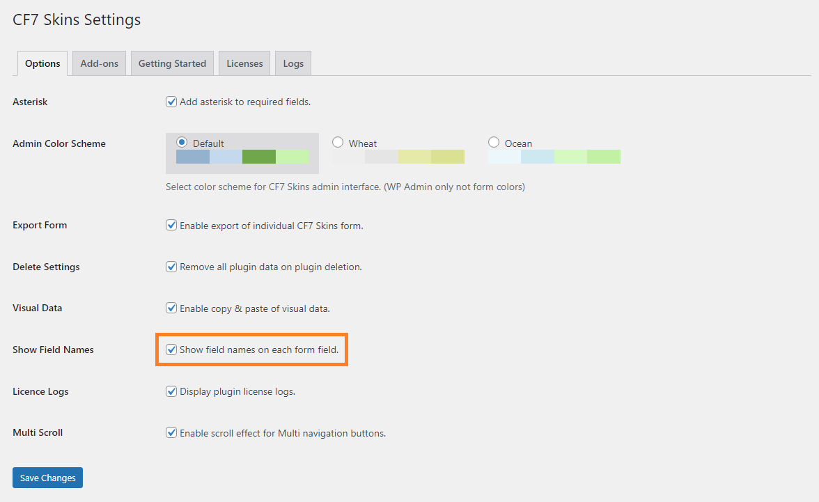 If the Show Field Names checkbox is checked, the field names appear on the Visual Form