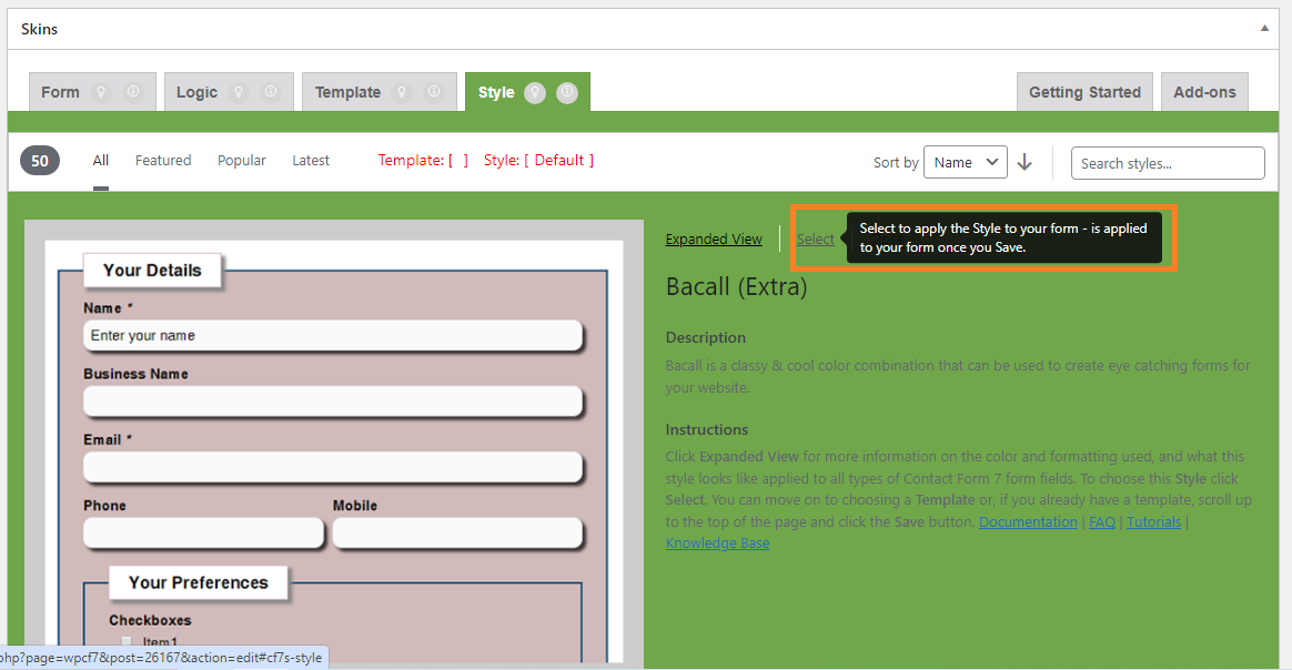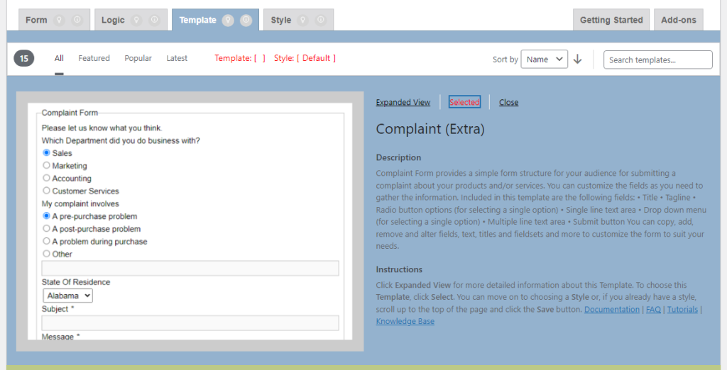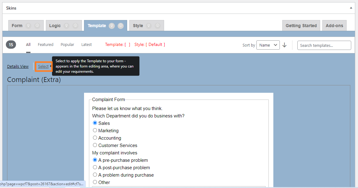 After Clicking on Select, the Template Status shows the selected template name.