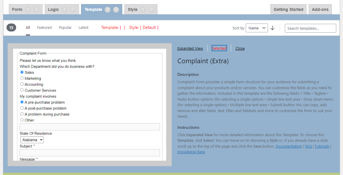 Template Description and Instructions matches the template