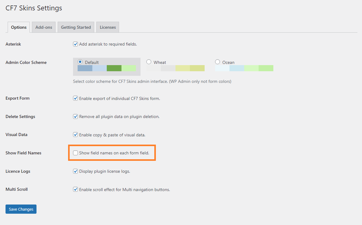 If the Show Field Names checkbox is unchecked, the field names is hidden on the Visual Form