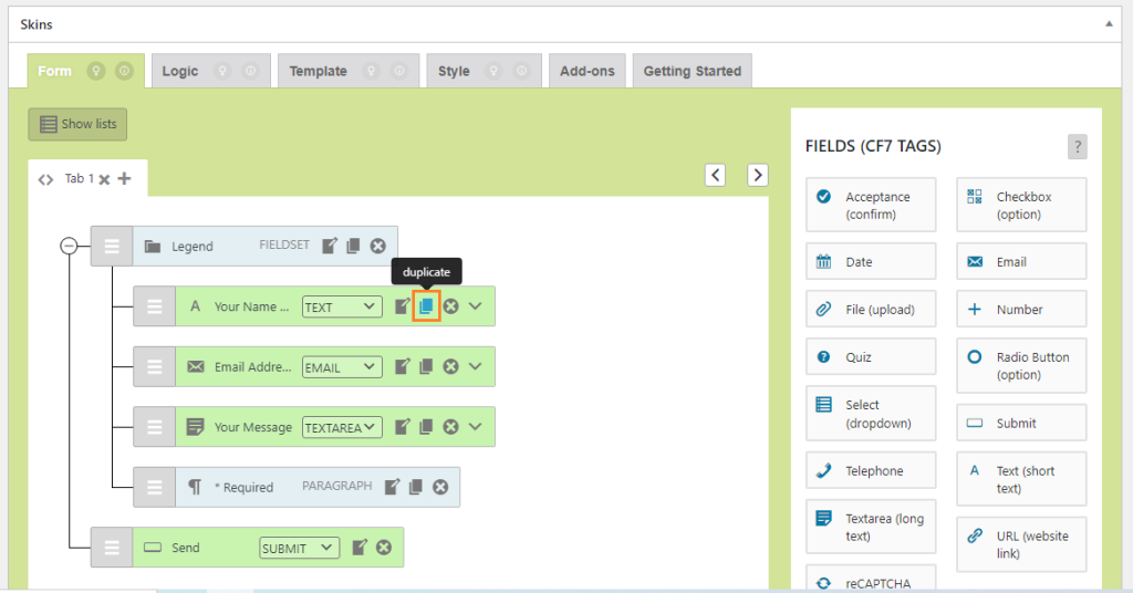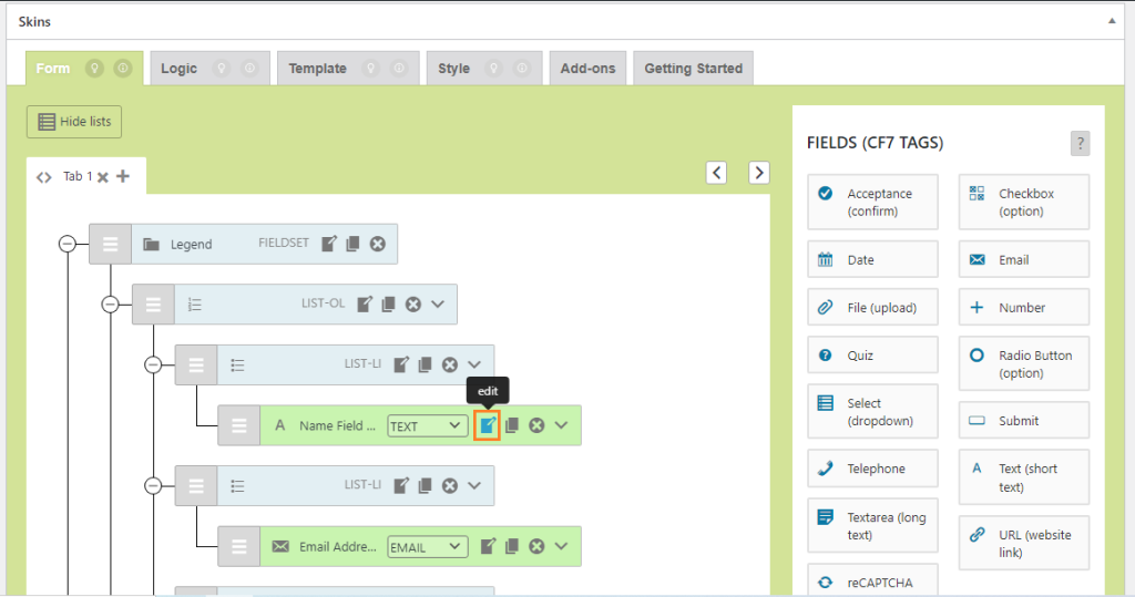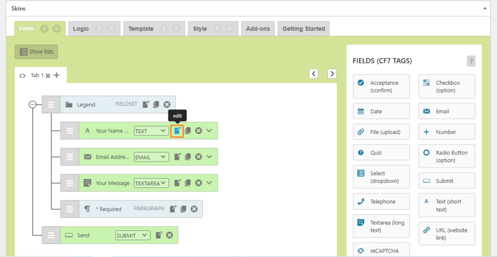 After clicking on save visual reopen the form and check the edited values remain the same in both Contact Form 7 Area and Field Edit box