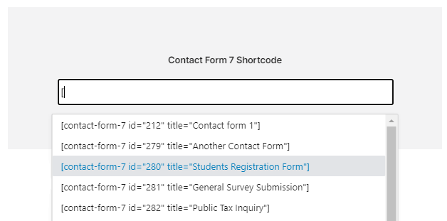 ☑ Typing in the shortcode input text should show a popup with all CF7 shortcodes.